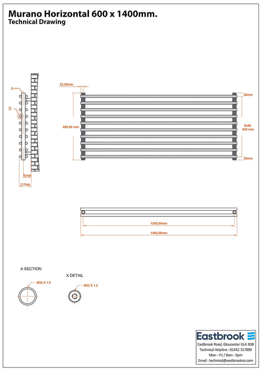 Eastbrook Murano Horizontal Electric Gloss White Designer Radiator 600mm x 1400mm