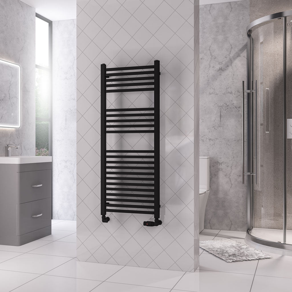 • Eastbrook Rion Electric Straight Matt Black Towel Rail 1200mm x 500mm